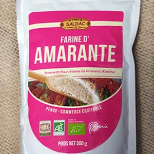 Farine d’amarante biologique. Idéal pour faire des crêpes (mettre 50 % d’amarante avec d’autres farines au choix), ou de la pâtisserie, du pain (60 % maximum). Pour un gâteau au chocolat possibilité de mettre 100 % de farine d’amarante.