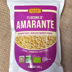Flocon d’amarante biologique. Idéal pour faire de la pâtisserie (mettre 50 % d’amarante avec d’autres farines au choix), ou du pain (60 % maximum). Pour un gâteau au chocolat possibilité de mettre 100 % de flocon d’amarante