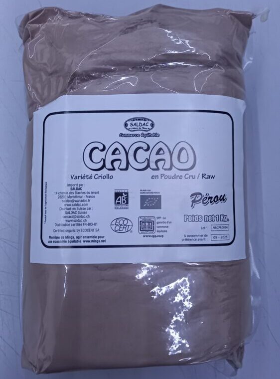 Cacao cru en poudre, biologique. Transformé au Pérou par une petite chocolaterie avec les fèves Criollo de la coopérative Pangoa et les fèves Chuncho (une variété locale de Criollo) de la coopérative Alto Urubamba. Puissant en arôme et très fruité. Excellent pour les chocolats chauds ou froids, les gâteaux. Encore plus de vitamines que dans le cacao torréfié.