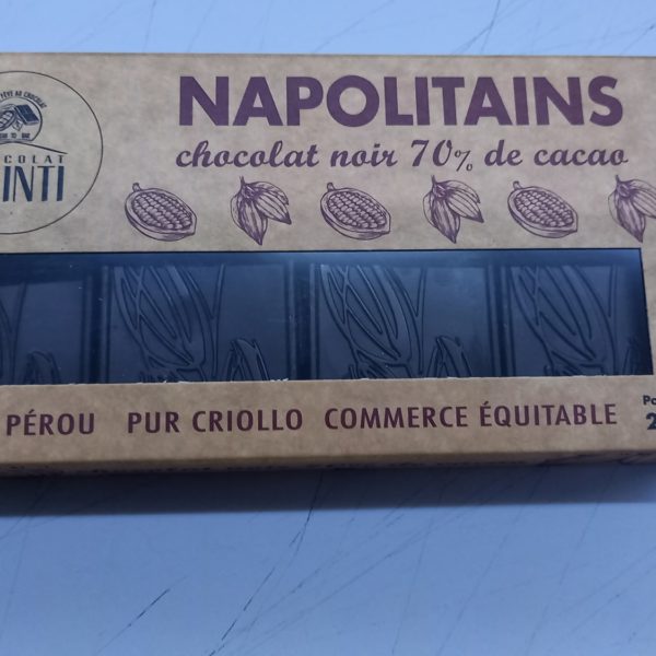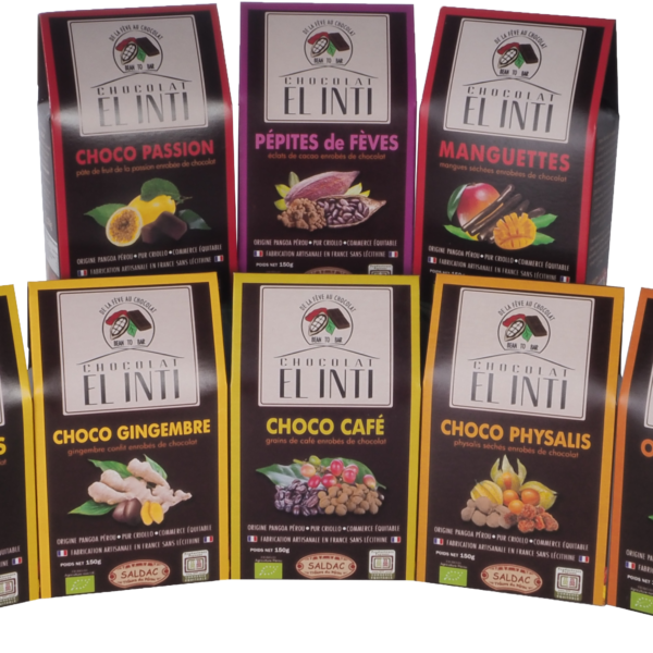 | Des petits carrés de chocolats noir à 70% de cacao, idéals pour accompagner une tasse de café El Palomar, ou à déguster tout simplement. Très fin, fondant et intense, un vrai délice !! Grand cru de pure origine Criollo, issu de la coop. Pangoa au Pérou, et d’une élaboration artisanale dans la Drôme qui lui révèle tout sa saveur. Sucre de canne complet du Pérou. Ingrédients : fèves de cacao, panela, beurre de cacao Caractéristiques nutritionnelles (valeurs moyennes pour 100g) Glucides : 44,5 g (dont sucres 27,1 g) Lipides : 43,6 g (dont acides gras saturés 26,3 g) Protéines : 8,8 g Sel : 0,08 g Valeur énergétique : 606 kcal / 2 519 kJ Notre gamme de chocolats est certifiée commerce équitable par le système SPP “Simbolo de los Pequenos Productores”, un label qui appartient enfin aux producteurs : www.spp.coop | À la passion, au gingembre, aux écorces d'oranges confites ou autres: notre sélection de ballotins saura satisfaire tous les gourmands et accompagner les meilleures tasses de café. Le chocolat des ballotins et napolitains El Inti est fabriqué avec les fèves de la coopérative Pangoa, située dans la province de Satipo, au début de la grande plaine amazonienne du Pérou. En plus, grâce à l’origine des fèves d’un seul et même terroir, aux exigences de sélection depuis la récolte jusqu’au séchage, le chocolat El Inti devient un chocolat Grand Cru. Notre gamme de chocolats est certifiée commerce équitable par le système SPP “Simbolo de los Pequenos Productores”, un label qui appartient enfin aux producteurs : www.spp.coop | Ces Chocolats intégralement biologiques, bénéficient du label équitable SPP pour toutes les parties de cacao. Tous les chocolats de la gamme Intégale ont en commun : o Fabriqués artisanalement par PJ Natura et moulés à la louche. o les « sucres » sont en fait des fruits lyophilisés (dattes ou figues), donc non cuits. N’étant pas cuits, ils sollicitent moins la production d’insuline et permettent aux diabétiques d’en consommer. Bien évidemment sans abus et dans le cadre de leur régime habituel. o Tous les fruits sont séchés à basse température et aucun n’a de sucre ajouté. Seulement leur sucre naturel, plus, pour certains, du jus de pomme biologique. o Pas de lécithine, ni de soja, ni de tournesol. Aucun allergène. o Tablettes de 70 g | Chocolats noirs de la gamme "El Inti", tablettes de 100 grammes. Divers parfums disponibles. Toutes les variétés proposées sont disponibles en boîtes de 19 pc. (sauf pommes-épices, 18 pc.) Produits à base de fèves de la variété Criollo uniquement, en provenance de la coopérative Pangoa (Pérou) et de sucre de canne complet (panela), biologique. Pour les connaisseurs de chocolats “Grand Cru”. Pure origine Criollo, très aromatique aux notes d’agrumes. Notre gamme de chocolats est certifiée commerce équitable via le label SPP “Simbolo de los Pequenos Productores”. Un label qui appartient aux producteurs : www.spp.coop | ||||||||||