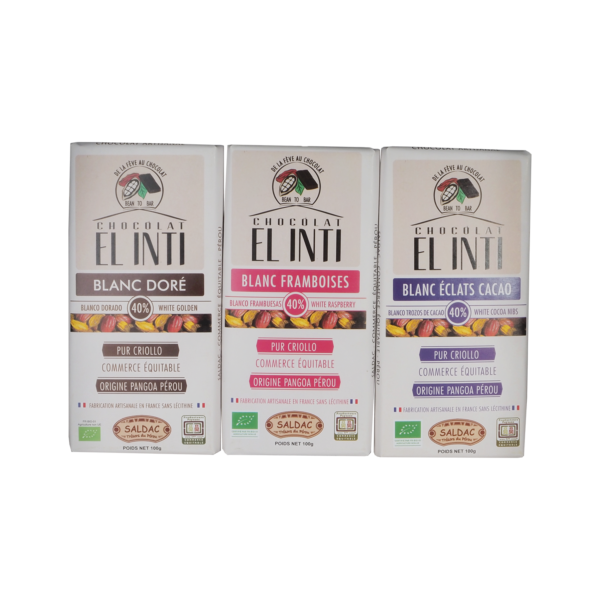 | Content | Le café “Sud du Cauca” de Colombie (vallée du Cauca) possède des arômes puissants de chocolat et de fruits rouges, crémeux, onctueux et long en bouche, issu d’un petit terroir d’altitude entre 1 400 et 1 700 m, également du commerce équitable. Produit par la coopérative Cosurca, terroir de Popayan, au sud de la Colombie. Café lavé. La Nouveauté 2021 : Torréfaction artisanale dans notre atelier à Montélimar, emballage sans aluminium. Il est présenté en sachet de 250 g avec valve pour maintenir toute sa fraîcheur, pour les particuliers, cafés, hôtels, restaurants et collectivités. Biologique, certifié Ecocert. Notre gamme de café est certifiée commerce équitable par le système SPP “Simbolo de los Pequenos Productores”, un label qui appartient enfin aux producteurs : www.spp.coop | Le chocolat Cru est fabriqué à moins de 45 °C, il conserve donc encore mieux ses vitamines et minéraux (magnésium, fer). Pure origine Criollo, très parfumé, se rapproche du goût de la fève, notes florales, d’agrumes et de cerises. Très intense en saveurs. Notre gamme de chocolats est certifiée commerce équitable par le système SPP “Simbolo de los Pequenos Productores”, un label qui appartient enfin aux producteurs : www.spp.coop | Chocolat blanc 40 % de cacao, beurre de cacao réalisé avec les fèves de la Coop. Pangoa Pérou, sucre de canne complet du Pérou (panela), lait entier, biologique. Notre gamme de chocolats est certifiée commerce équitable par le système SPP “Simbolo de los Pequenos Productores”, un label qui appartient enfin aux producteurs : www.spp.coop | Ces Chocolats intégralement biologiques, bénéficient du label équitable SPP pour toutes les parties de cacao. Tous les chocolats de la gamme Intégale ont en commun : o Fabriqués artisanalement par PJ Natura et moulés à la louche. o les « sucres » sont en fait des fruits lyophilisés (dattes ou figues), donc non cuits. N’étant pas cuits, ils sollicitent moins la production d’insuline et permettent aux diabétiques d’en consommer. Bien évidemment sans abus et dans le cadre de leur régime habituel. o Tous les fruits sont séchés à basse température et aucun n’a de sucre ajouté. Seulement leur sucre naturel, plus, pour certains, du jus de pomme biologique. o Pas de lécithine, ni de soja, ni de tournesol. Aucun allergène. o Tablettes de 70 g |