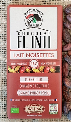Ingrédients : fèves de cacao, panela, lait, noisettes 15%, beurre de cacao