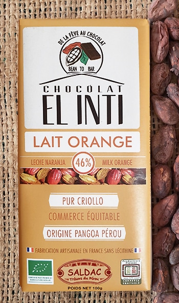 | Content | Tablette de 100gr de chocolat au lait entier 46 % de cacao, huile essentielle d’orange. Ingrédients : fèves de cacao, panela, lait, beurre de cacao, huile essentielle d’orange. Orange et chocolat, un mélange parfait !! bien équilibré, savoureux, onctueux. On en mangerait bien un carré de plus !! Caractéristiques nutritionnelles (valeurs moyennes pour 100g) Glucides : 45,4 g (dont sucres 39,5 g) Lipides : 43,2 g (dont acides gras saturés 25,3 g) Protéines : 8,2 g Sel : 0,3 g Valeur énergétique : 603 kcal / 2 510 kJ | Sachet de 250gr de fèves de cacao torréfiées biologiques, variété Criollo, riche en magnésium. A grignoter simplement, où à écraser avec du sucre pour fabriquer son chocolat artisanal. Possibilité de les enrober de chocolat, mettre des petits bouts dans les pâtisseries… Ingrédients : fèves de cacao torréfiées Caractéristiques nutritionnelles (valeurs moyennes pour 100g) Glucides : 31,2 g (dont sucres 0,4 g) Lipides : 51,3 g (dont acides gras saturés 28,4 g) Protéines : 12,3 g Sel : 0,01 g Valeur énergétique : 636 kcal / 2 638 kJ | Ces Chocolats intégralement biologiques, bénéficient du label équitable SPP pour toutes les parties de cacao. Tous les chocolats de la gamme Intégale ont en commun : o Fabriqués artisanalement par PJ Natura et moulés à la louche. o les « sucres » sont en fait des fruits lyophilisés (dattes ou figues), donc non cuits. N’étant pas cuits, ils sollicitent moins la production d’insuline et permettent aux diabétiques d’en consommer. Bien évidemment sans abus et dans le cadre de leur régime habituel. o Tous les fruits sont séchés à basse température et aucun n’a de sucre ajouté. Seulement leur sucre naturel, plus, pour certains, du jus de pomme biologique. o Pas de lécithine, ni de soja, ni de tournesol. Aucun allergène. o Tablettes de 70 g | À la passion, au gingembre, aux écorces d'oranges confites ou autres: notre sélection de ballotins saura satisfaire tous les gourmands et accompagner les meilleures tasses de café. Le chocolat des ballotins et napolitains El Inti est fabriqué avec les fèves de la coopérative Pangoa, située dans la province de Satipo, au début de la grande plaine amazonienne du Pérou. En plus, grâce à l’origine des fèves d’un seul et même terroir, aux exigences de sélection depuis la récolte jusqu’au séchage, le chocolat El Inti devient un chocolat Grand Cru. Notre gamme de chocolats est certifiée commerce équitable par le système SPP “Simbolo de los Pequenos Productores”, un label qui appartient enfin aux producteurs : www.spp.coop | ||||||||||||||