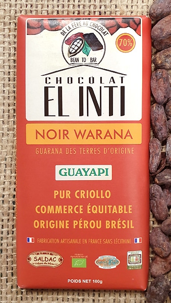 | Content | Tablette 100gr de chocolat noir 70 % de cacao, 4 % de Warana en poudre (le Guarana d’origine) Ingrédients : fèves de cacao, panela, beurre de cacao, guarana en poudre 4% Valeurs nutritionnelles (valeurs moyennes pour 100g) Glucides : 45,6 g (dont sucres 27,6 g) / Lipides : 41,1 g (dont acides gras saturés 25,2 g) / Protéines : 10 g / Sel : 0,07 g / Valeur énergétique : 597 kcal / 2 288 kJ | Sachet de 250gr de fèves de cacao torréfiées biologiques, variété Criollo, riche en magnésium. A grignoter simplement, où à écraser avec du sucre pour fabriquer son chocolat artisanal. Possibilité de les enrober de chocolat, mettre des petits bouts dans les pâtisseries… Ingrédients : fèves de cacao torréfiées Caractéristiques nutritionnelles (valeurs moyennes pour 100g) Glucides : 31,2 g (dont sucres 0,4 g) Lipides : 51,3 g (dont acides gras saturés 28,4 g) Protéines : 12,3 g Sel : 0,01 g Valeur énergétique : 636 kcal / 2 638 kJ | Sachet de 250gr. Ingrédients : fèves de cacao, panela Caractéristiques nutritionnelles (valeurs moyennes pour 100 g) Glucides : 52,4 g (dont sucres 34,7 g) Lipides : 37,1 g (dont acides gras saturés 17,4 g) Protéines : 7,3 g Sel : 0,08 g Valeur énergétique : 573 kcal / 2 388 kJ | Chocolats noirs de la gamme "El Inti", tablettes de 100 grammes. Divers parfums disponibles. Toutes les variétés proposées sont disponibles en boîtes de 19 pc. (sauf pommes-épices, 18 pc.) Produits à base de fèves de la variété Criollo uniquement, en provenance de la coopérative Pangoa (Pérou) et de sucre de canne complet (panela), biologique. Pour les connaisseurs de chocolats “Grand Cru”. Pure origine Criollo, très aromatique aux notes d’agrumes. Notre gamme de chocolats est certifiée commerce équitable via le label SPP “Simbolo de los Pequenos Productores”. Un label qui appartient aux producteurs : www.spp.coop | ||||||||||
