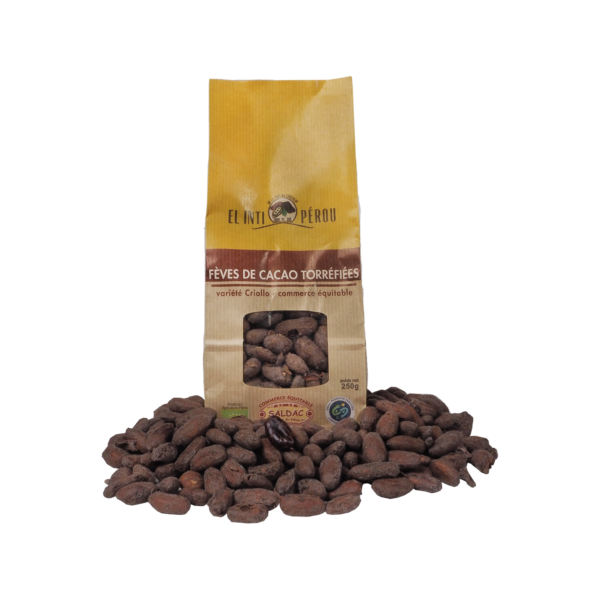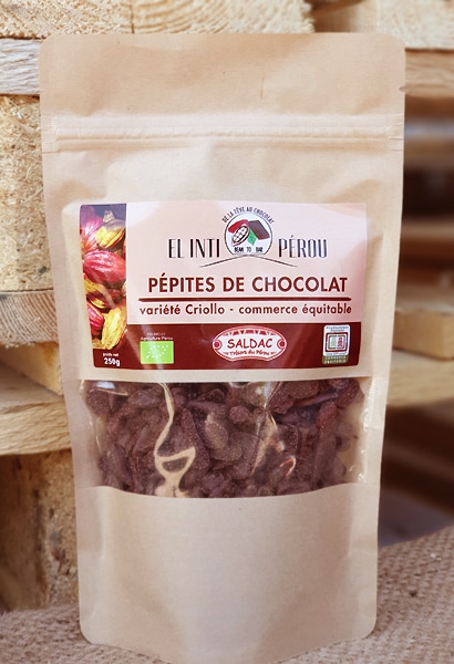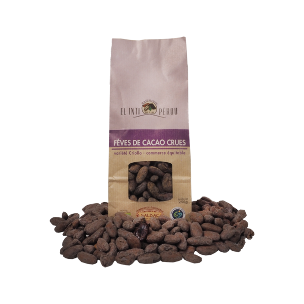| Content | Sachet de 250gr de fèves de cacao crues biologiques, variété Criollo, riche en magnésium. A grignoter simplement, où à faire griller et écraser avec du sucre pour fabriquer son chocolat artisanal. Ingrédients : fèves de cacao crues Caractéristiques nutritionnelles (valeurs moyennes pour 100g) Glucides : 24,4 g (dont sucres 0,5 g) Lipides : 57 g (dont acides gras saturés 33,5 g) Protéines : 12,2 g Sel : 0,01 g Valeur énergétique : 659 kcal / 2 731 kJ | Sachet de 250gr de fèves de cacao torréfiées biologiques, variété Criollo, riche en magnésium. A grignoter simplement, où à écraser avec du sucre pour fabriquer son chocolat artisanal. Possibilité de les enrober de chocolat, mettre des petits bouts dans les pâtisseries… Ingrédients : fèves de cacao torréfiées Caractéristiques nutritionnelles (valeurs moyennes pour 100g) Glucides : 31,2 g (dont sucres 0,4 g) Lipides : 51,3 g (dont acides gras saturés 28,4 g) Protéines : 12,3 g Sel : 0,01 g Valeur énergétique : 636 kcal / 2 638 kJ | Chocolats noirs de la gamme "El Inti", tablettes de 100 grammes. Divers parfums disponibles. Toutes les variétés proposées sont disponibles en boîtes de 19 pc. (sauf pommes-épices, 18 pc.) Produits à base de fèves de la variété Criollo uniquement, en provenance de la coopérative Pangoa (Pérou) et de sucre de canne complet (panela), biologique. Pour les connaisseurs de chocolats “Grand Cru”. Pure origine Criollo, très aromatique aux notes d’agrumes. Notre gamme de chocolats est certifiée commerce équitable via le label SPP “Simbolo de los Pequenos Productores”. Un label qui appartient aux producteurs : www.spp.coop | Le chocolat Cru est fabriqué à moins de 45 °C, il conserve donc encore mieux ses vitamines et minéraux (magnésium, fer). Pure origine Criollo, très parfumé, se rapproche du goût de la fève, notes florales, d’agrumes et de cerises. Très intense en saveurs. Notre gamme de chocolats est certifiée commerce équitable par le système SPP “Simbolo de los Pequenos Productores”, un label qui appartient enfin aux producteurs : www.spp.coop | ||||||||||