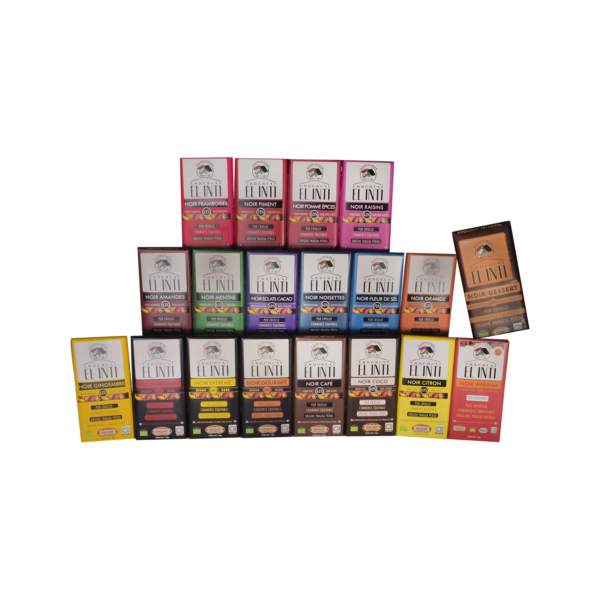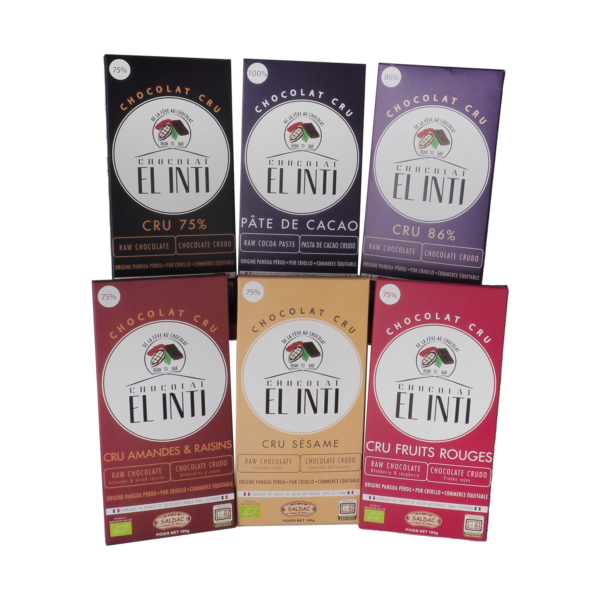 | Settings | Fèves de cacao séchées, bio, équitable, 250gr remove | Beurre, Fèves, Nibs et Cacao en Vrac remove | Fèves de cacao torréfiées, bio, équitable, 250gr remove | Chocolats noirs, El Inti, fabrication artisanale, tablettes 100gr remove | Beurre de cacao cru non-fermenté, bio, équitable, 250gr remove | Chocolat Cru, El Inti, tablettes 100gr remove | ||||||||