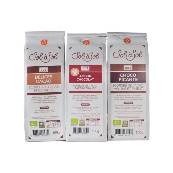 | Content | Sachet de 250gr de fèves de cacao crues biologiques, variété Criollo, riche en magnésium. A grignoter simplement, où à faire griller et écraser avec du sucre pour fabriquer son chocolat artisanal. Ingrédients : fèves de cacao crues Caractéristiques nutritionnelles (valeurs moyennes pour 100g) Glucides : 24,4 g (dont sucres 0,5 g) Lipides : 57 g (dont acides gras saturés 33,5 g) Protéines : 12,2 g Sel : 0,01 g Valeur énergétique : 659 kcal / 2 731 kJ | À la passion, au gingembre, aux écorces d'oranges confites ou autres: notre sélection de ballotins saura satisfaire tous les gourmands et accompagner les meilleures tasses de café. Le chocolat des ballotins et napolitains El Inti est fabriqué avec les fèves de la coopérative Pangoa, située dans la province de Satipo, au début de la grande plaine amazonienne du Pérou. En plus, grâce à l’origine des fèves d’un seul et même terroir, aux exigences de sélection depuis la récolte jusqu’au séchage, le chocolat El Inti devient un chocolat Grand Cru. Notre gamme de chocolats est certifiée commerce équitable par le système SPP “Simbolo de los Pequenos Productores”, un label qui appartient enfin aux producteurs : www.spp.coop | À la passion, au gingembre, aux écorces d'oranges confites ou autres: notre sélection de ballotins saura satisfaire tous les gourmands et accompagner les meilleures tasses de café. Le chocolat des ballotins et napolitains El Inti est fabriqué avec les fèves de la coopérative Pangoa, située dans la province de Satipo, au début de la grande plaine amazonienne du Pérou. En plus, grâce à l’origine des fèves d’un seul et même terroir, aux exigences de sélection depuis la récolte jusqu’au séchage, le chocolat El Inti devient un chocolat Grand Cru. Notre gamme de chocolats est certifiée commerce équitable par le système SPP “Simbolo de los Pequenos Productores”, un label qui appartient enfin aux producteurs : www.spp.coop | Pâte à tartiner à base de notre cacao en poudre Criollo (pas d’huile de palme). Saveur très cacaotée et riche en noisette. Un délice pour les papilles Ingrédients : Noisettes 23%, sucre de canne blond, sucre de canne complet, cacao en poudre 11%, huile de tournesol, lait entier en poudre. Caractéristiques nutritionnelles (valeurs moyennes pour 100g) Glucides : 52,7 g (dont sucres 43 g) Lipides : 34,5 g (dont acides gras saturés 5,9 g) Protéines : 9,9 g Sel : 0,14 gValeur énergétique : 561 kcal / 2 341 kJ | ||||||||||||