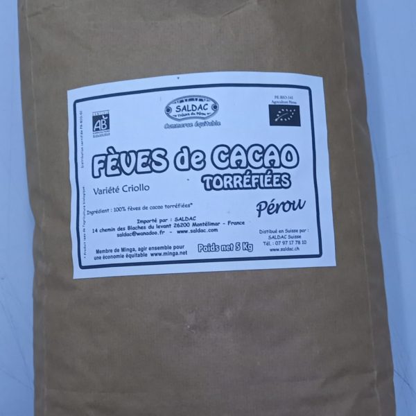 Sac de 5kg de fèves de cacao torréfiées biologiques, variété Criollo, riche en magnésium.