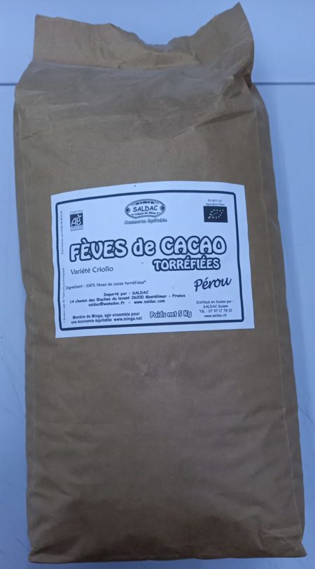 | Content | Sac de 5kg de fèves de cacao torréfiées biologiques, variété Criollo, riche en magnésium. A grignoter simplement, où à écraser avec du sucre pour fabriquer son chocolat artisanal. Possibilité de les enrober de chocolat, mettre des petits bouts dans les pâtisseries… Ingrédients : fèves de cacao torréfiées Caractéristiques nutritionnelles (valeurs moyennes pour 100g) Glucides : 31,2 g (dont sucres 0,4 g) Lipides : 51,3 g (dont acides gras saturés 28,4 g) Protéines : 12,3 g Sel : 0,01 g Valeur énergétique : 636 kcal / 2 638 kJ | Sachet de 1kg de cacao pur en poudre, bio. Transformé au Pérou par une petite chocolaterie avec les fèves Criollo de la coopérative Pangoa et les fèves Chuncho (une variété locale de Criollo) de la coopérative Alto Urubamba. Puissant en arôme. Excellent pour les chocolats chauds ou froids, les gâteaux. Ingrédients : 100 % cacao en poudre | Chocolat au lait 46 % de cacao, fèves de la Coop. Pangoa Pérou, sucre de canne complet du Pérou (panela), lait entier, biologique. De grands crus au lait, très fondants et parfumés, excellents pour le goûter des petits et des grands. Notre gamme de chocolats est certifiée commerce équitable par le système SPP “Simbolo de los Pequenos Productores”, un label qui appartient enfin aux producteurs : www.spp.coop | Sachet de 250gr de fèves de cacao torréfiées biologiques, variété Criollo, riche en magnésium. A grignoter simplement, où à écraser avec du sucre pour fabriquer son chocolat artisanal. Possibilité de les enrober de chocolat, mettre des petits bouts dans les pâtisseries… Ingrédients : fèves de cacao torréfiées Caractéristiques nutritionnelles (valeurs moyennes pour 100g) Glucides : 31,2 g (dont sucres 0,4 g) Lipides : 51,3 g (dont acides gras saturés 28,4 g) Protéines : 12,3 g Sel : 0,01 g Valeur énergétique : 636 kcal / 2 638 kJ | Sachet de 250gr. Ingrédients : fèves de cacao, panela Caractéristiques nutritionnelles (valeurs moyennes pour 100 g) Glucides : 52,4 g (dont sucres 34,7 g) Lipides : 37,1 g (dont acides gras saturés 17,4 g) Protéines : 7,3 g Sel : 0,08 g Valeur énergétique : 573 kcal / 2 388 kJ | |||||||||||