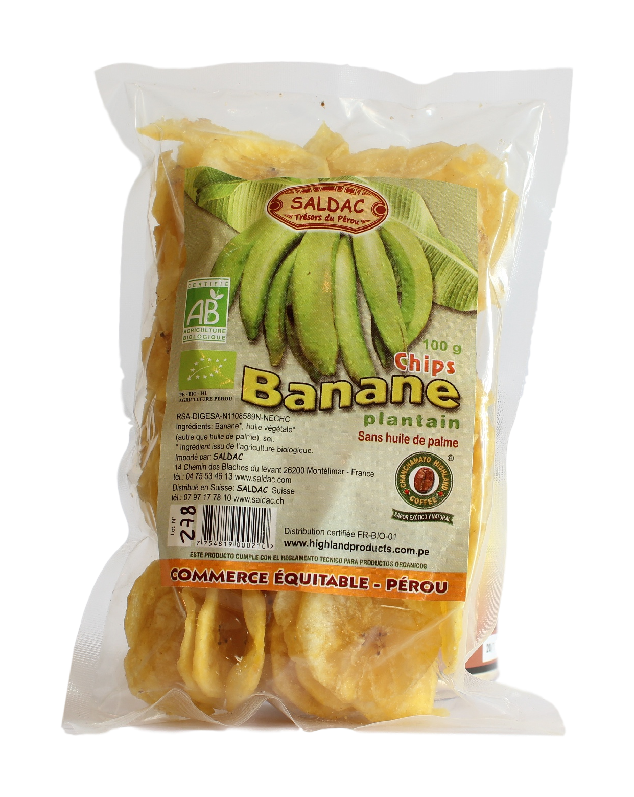 Chips de banane plantain verte biologiques, salées, excellent pour l’apéritif, ou à grignoter à toute heure de la journée. Croquantes et savoureuses. Très bien aussi pour accompagner du poisson.