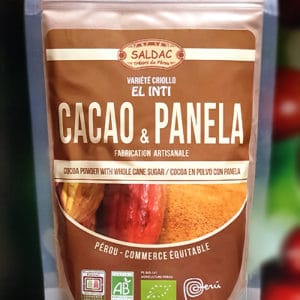 | Content | Sachet de 100gr Vente uniquement par 6 pour les professionnels/partenaires Certifié Commerce équitable par Fair For Life (FFL). | Cacao en poudre sucré avec du sucre de canne complet “panela” biologique. Transformé au Pérou par une petite chocolaterie avec les fèves Criollo de la coopérative Pangoa et les fèves Chuncho (une variété locale de Criollo) de la coopérative Alto Urubamba. Ingrédients : cacao 50 %, sucre de canne complet 50 % Caractéristiques nutritionnelles (valeurs moyennes pour 100g) Glucides : 72,2 g (dont sucres 34,1 g) Lipides : 6,6 g (dont acides gras saturés 3,5 g) Protéines : 13,6 g Sel : 0,1 g Valeur énergétique : 403 kcal / 1 702 kJ Fer : 9,9 mg Magnésium : 287 mg Calcium : 108 mg Phosphore : 469 mg Bien équilibré en arôme (50% de cacao et 50% de sucre), ce cacao est excellent pour les chocolats chauds ou froids, ou les gâteaux. Notre gamme de cacao en poudre est certifiée commerce équitable par le système SPP “Simbolo de los Pequenos Productores”, un label qui appartient enfin aux producteurs : www.spp.coop | Le chocolat Cru est fabriqué à moins de 45 °C, il conserve donc encore mieux ses vitamines et minéraux (magnésium, fer). Pure origine Criollo, très parfumé, se rapproche du goût de la fève, notes florales, d’agrumes et de cerises. Très intense en saveurs. Notre gamme de chocolats est certifiée commerce équitable par le système SPP “Simbolo de los Pequenos Productores”, un label qui appartient enfin aux producteurs : www.spp.coop |