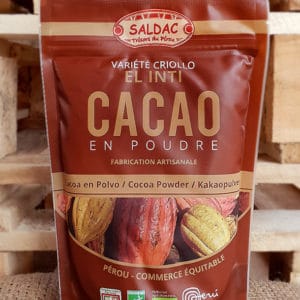 Cacao cru en poudre, biologique. Transformé au Pérou par une petite chocolaterie avec les fèves Criollo de la coopérative Pangoa et les fèves Chuncho (une variété locale de Criollo) de la coopérative Alto Urubamba. Puissant en arôme et très fruité. Excellent pour les chocolats chauds ou froids, les gâteaux. Encore plus de vitamines que dans le cacao torréfié.