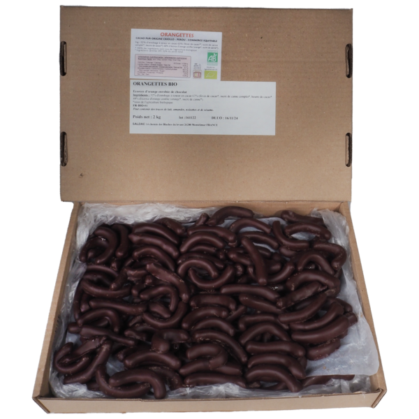 Boîte de 2kg d’écorces d’oranges confites enrobées de chocolat noir 63 %.