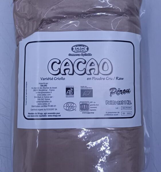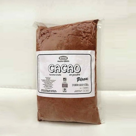 Cacao cru en poudre, biologique. Transformé au Pérou par une petite chocolaterie avec les fèves Criollo de la coopérative Pangoa et les fèves Chuncho (une variété locale de Criollo) de la coopérative Alto Urubamba. Puissant en arôme et très fruité. Excellent pour les chocolats chauds ou froids, les gâteaux. Encore plus de vitamines que dans le cacao torréfié.