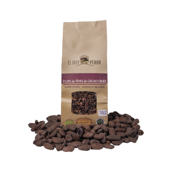| Sachet de 250gr d'éclats de fèves de cacao crues biologiques (nibs), variété Criollo, riche en fer et en magnésium. Ingrédients : éclats de fèves de cacao crues | Sachet de 250gr. Ingrédients : fèves de cacao, panela Caractéristiques nutritionnelles (valeurs moyennes pour 100 g) Glucides : 52,4 g (dont sucres 34,7 g) Lipides : 37,1 g (dont acides gras saturés 17,4 g) Protéines : 7,3 g Sel : 0,08 g Valeur énergétique : 573 kcal / 2 388 kJ | |||||||||||||||